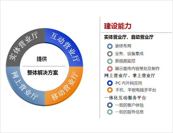 涵盖引导区、业务代办区、互联网服务终端、智能营业终端、自助缴费终端、网上营业厅、手机营业厅、移动智能终端程序、多功能书写台等,实现智能营业厅运行的信息化、互动化、智能化。